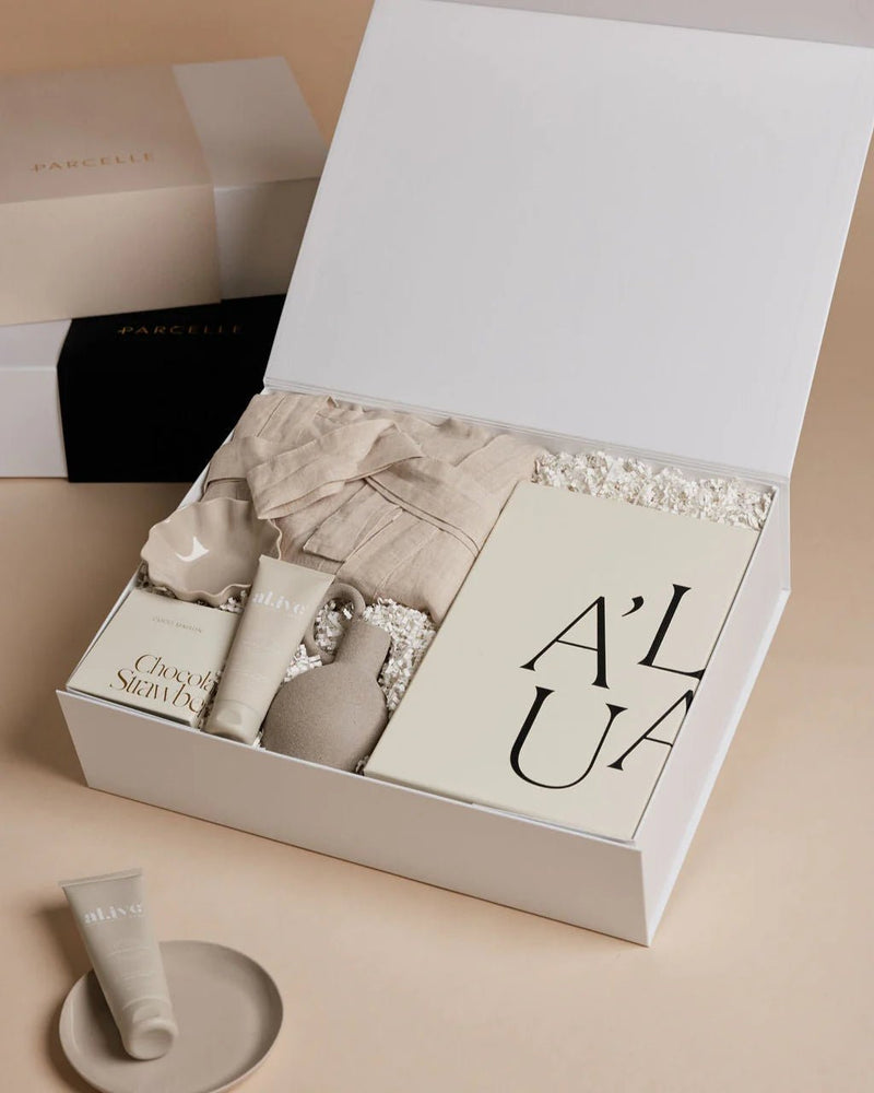 Beautifully presented in Parcelle’s Signature Magnetic Close XL Gift Box with your choice of velvet-touch sleeve. Optional branding available for corporate gifting and bridal events.